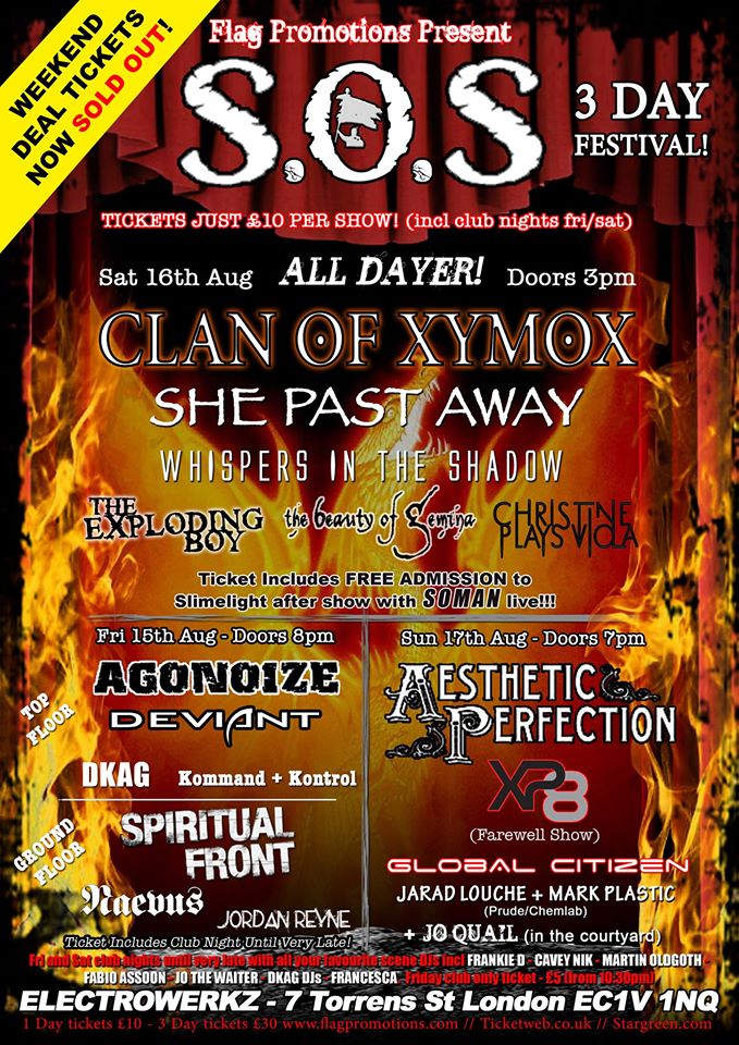 Meanwhile, veteran London promoter Frank Flag has pulled out the stops and tapped his contacts for venues to put up many of the bands who were due to play the Goth / Industrial stages. Called S.O.S – for Save Our Scene – it’s also running the weekend of 15th-17th August with a generous portion of bands playing at Electrowerkz in the Slimelight building.