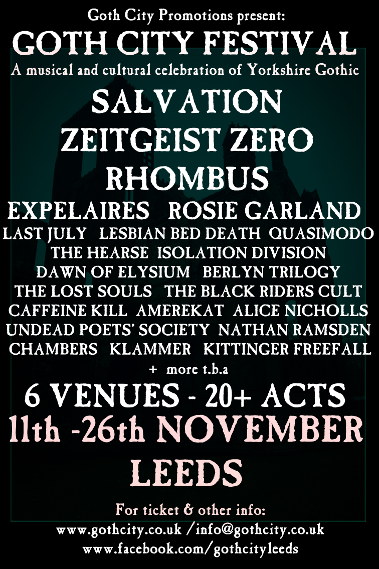Held in Leeds Six – naturally – you can register your interest in this one of a kind event on Facebook, and ensure you investigate all the possibilities to wallow in Goth this festival offers you. All credit must go to the unstoppable energy of Joel, who I thank deeply for the invitation to participate, and salute his goal to give all proceeds to PAFRAS (Positive Action For Refugees and Asylum Seekers).