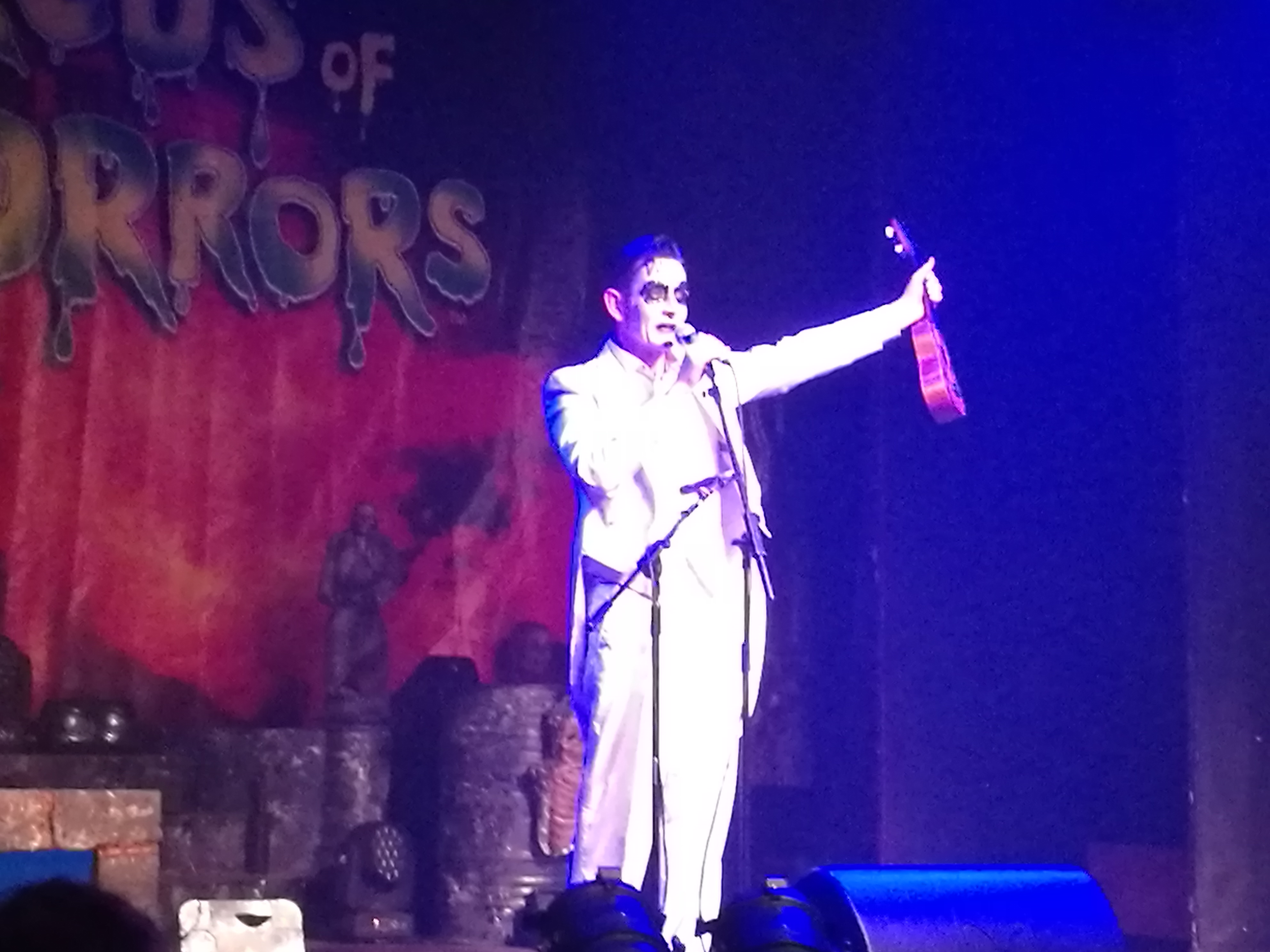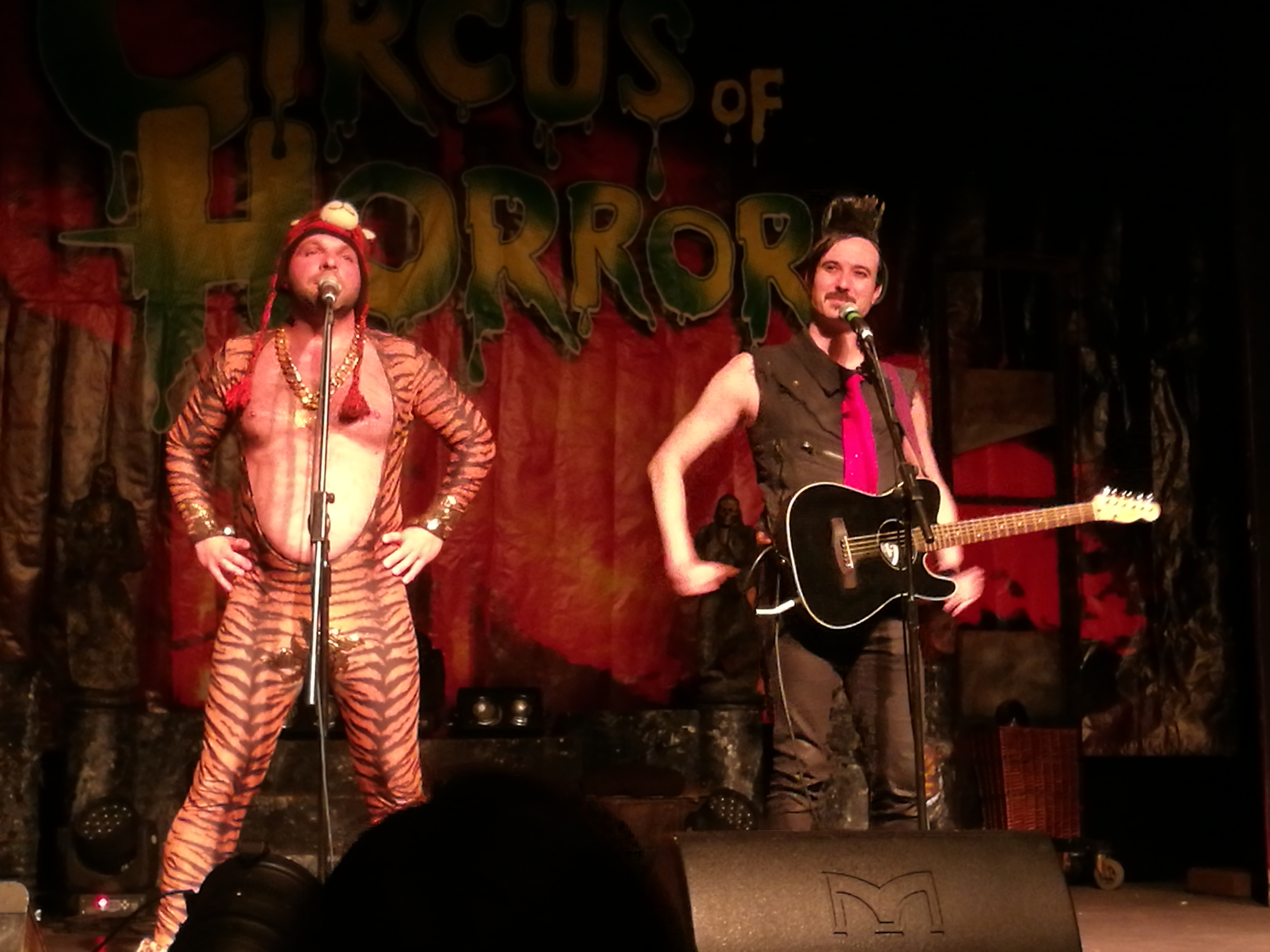 Dok Haze’s “Circus of Horrors” Part One – To make up for there only being three performers on Friday, the crew from the Circus of Horrors were putting on two acts. Their MC was a fantastically made-up Count Orlok, who immediately began quipping about blowjobs, so the comedy level was at least consistent. I notice that the audience was fairly young, ironic considering this would be one of the most ‘adult’ night of performances I’ve seen yet. Anyway, the show begins with a talented contortionist, and two acrobatic blood-stained girls on a suspended hoist. Meanwhile, the light and sound crew are working overdrive to provide the right atmosphere, and it’s a stellar performance all taken together. That is, if you like your horror served shlock, and your sex done PG all overlaid with a faux-serious attitude.