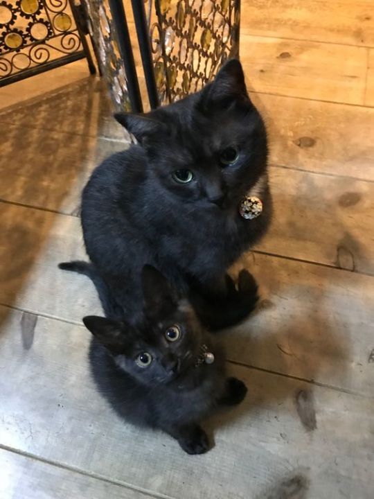 Kuro and Yami are my two black kitties. Well, Kuro is mine, and technically Yami is my dad’s. They are both rescue cats. Kuro was adopted from a shelter and him finding a home was compounded in difficulty by him being a feral kitten. He’s still not the most social cat, and woe betide the fool that tries to pick him up, but he’s been with us 9 years and is much loved. He follows me around at a distance, like a not-very-subtle assassin. Yami followed Kuro home one day and doesn’t understand why Kuro was not happy about this. Yami is two. At one point he was in a foster cattery, but ran off and got lost, then a bit later he was caught by a catch-neuter-release program for stray/feral cats, and then he wandered to my Dad’s door. Yami is a small furry idiot, but he’s *our* small furry idiot. Yami is very affectionate, to the point of being a bit of a limpet; that cat is clingy!