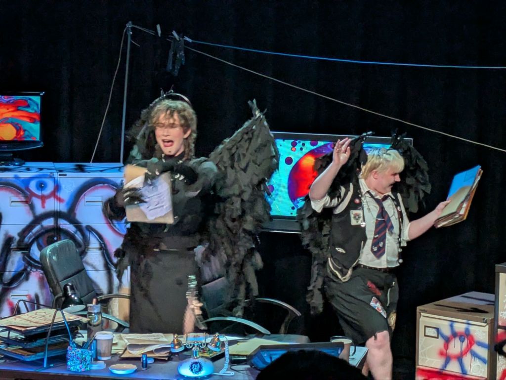 Lasting just an hour, yet brimming with creativity, we are first introduced to Sid and Viv asleep at their desk – well-dressed, wing-sprouting cogs in the Almighty civil service called Omniscience. Supposedly tasked with monitoring spots on Earth – fittingly enough, tucked away in deepest ‘Boro – our two ‘angels’ are more interested in carving out their own defiant rebellious little outpost than following the nice, normal and compliant course charted for them – for everyone – by Omniscience.